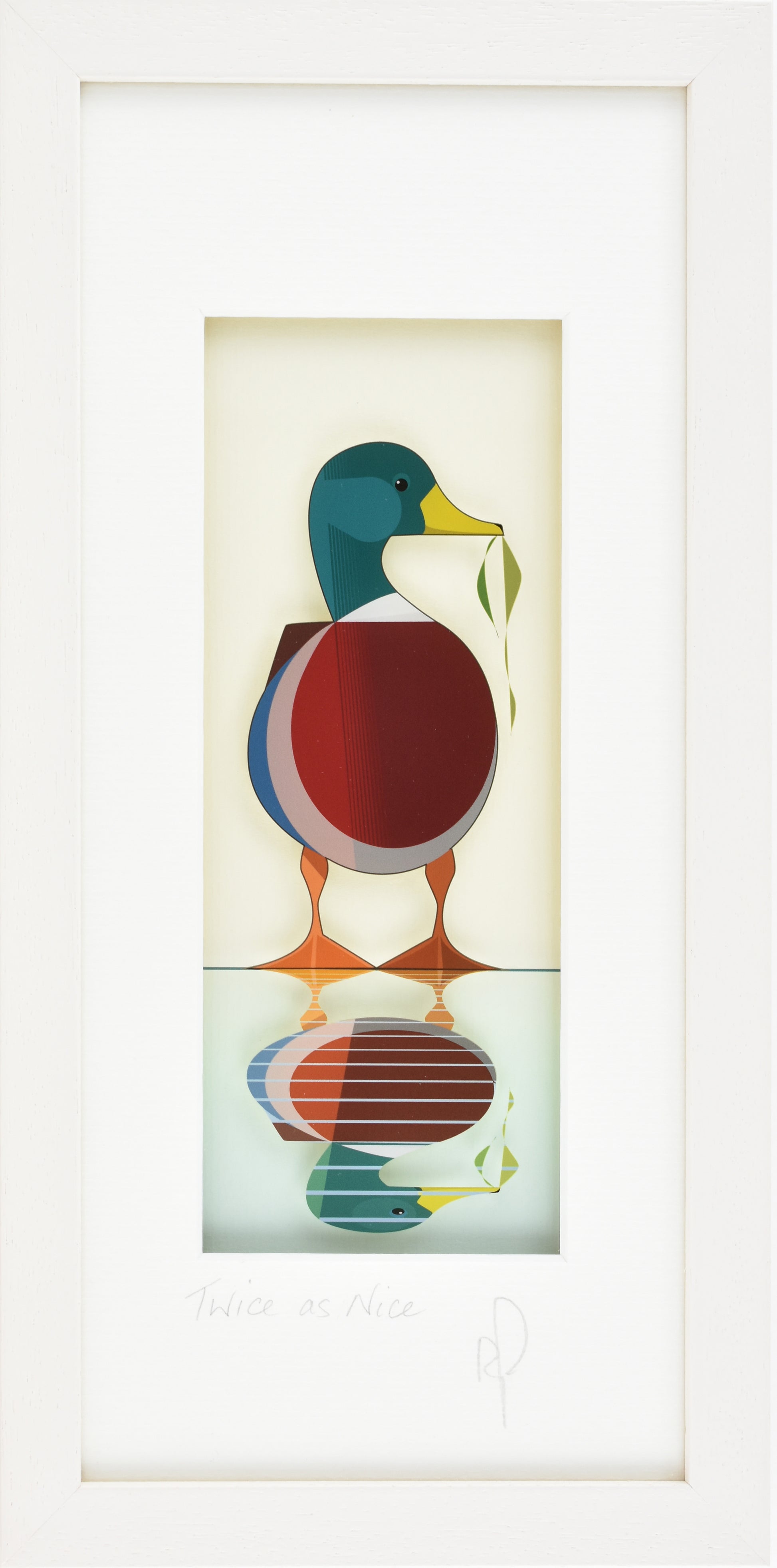 Introducing Twice As Nice: an adorable wall art print that will brighten any room in your home! This beautiful print features a dashing duck admiring his own reflection in the water - so much cuteness that you won't know who to look at first! Get twice the impact with this charming piece of wall art.