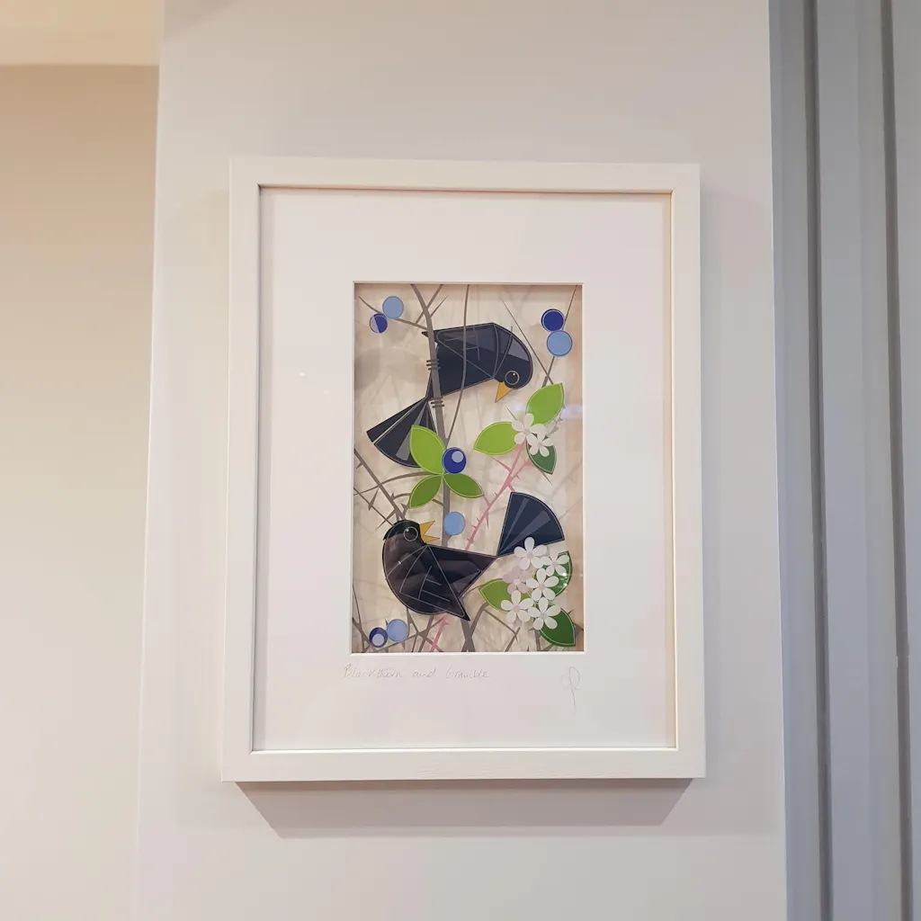 Get lost in the whimsical world of nature with our Blackthorn and Bramble framed print. Watch as two blackbirds feast on delicious sloe berries from the Blackthorn bush. With this unique piece, bring the beauty and quirkiness of nature into your home.
