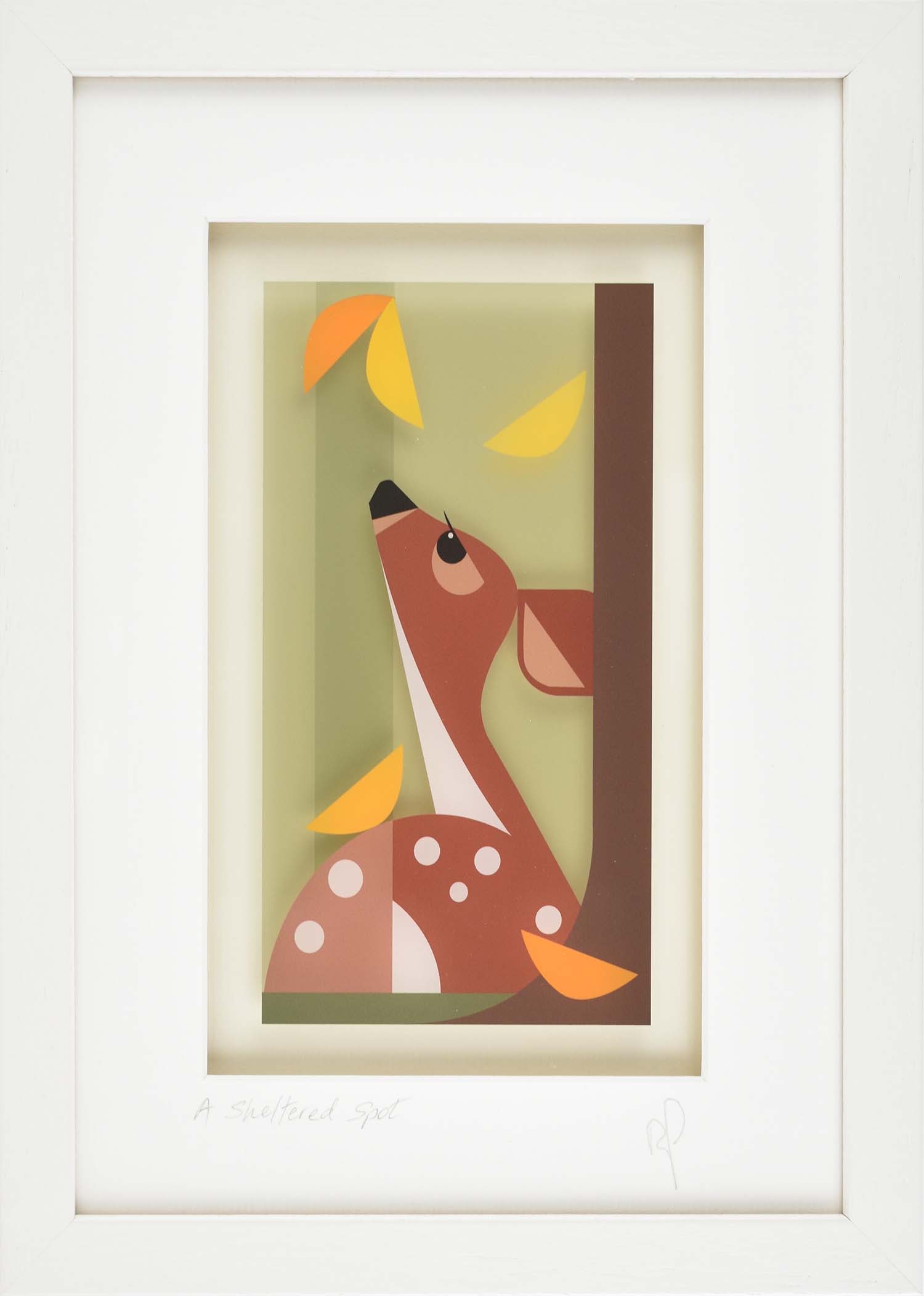 A young fawn nestles peacefully beneath a canopy of trees, surrounded by a burst of vibrant foliage in every direction. This charming scene captures a moment of quiet sanctuary in nature, where dappled light filters through the leaves and creates a magical woodland hideaway. Perfect for anyone who loves wildlife, natural beauty, and the gentle wonder of forest life.